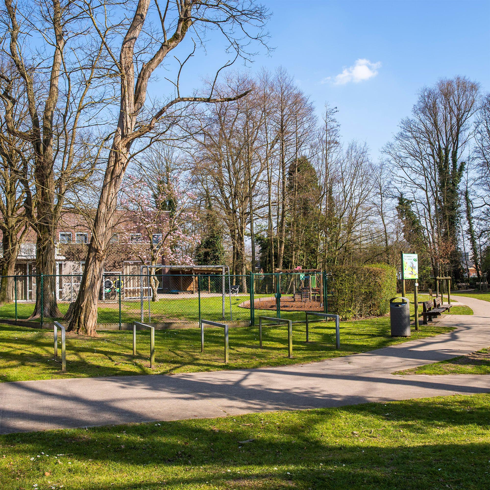 Een veilige, afgesloten omgeving die enkel toegankelijk is via een centrale inrit voor wagens en een afzonderlijke inkom voor voetgangers en fietsers.