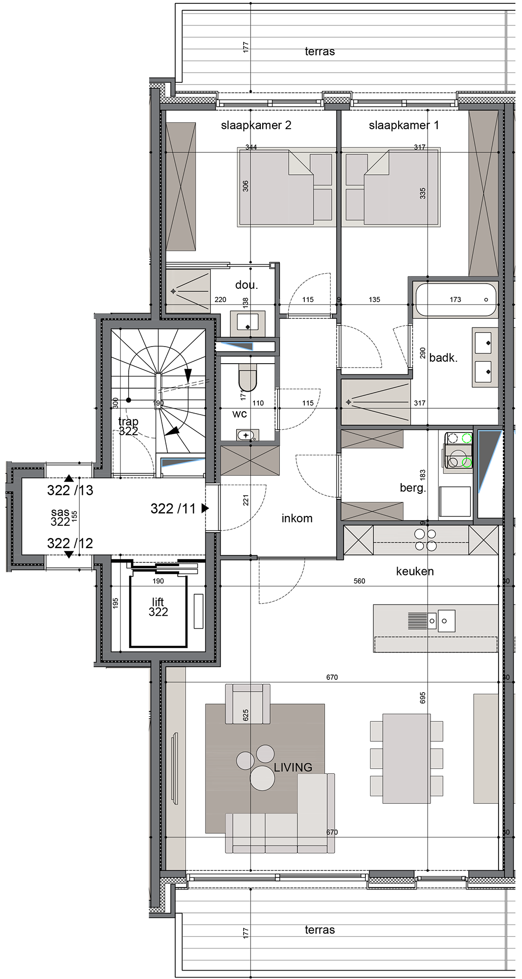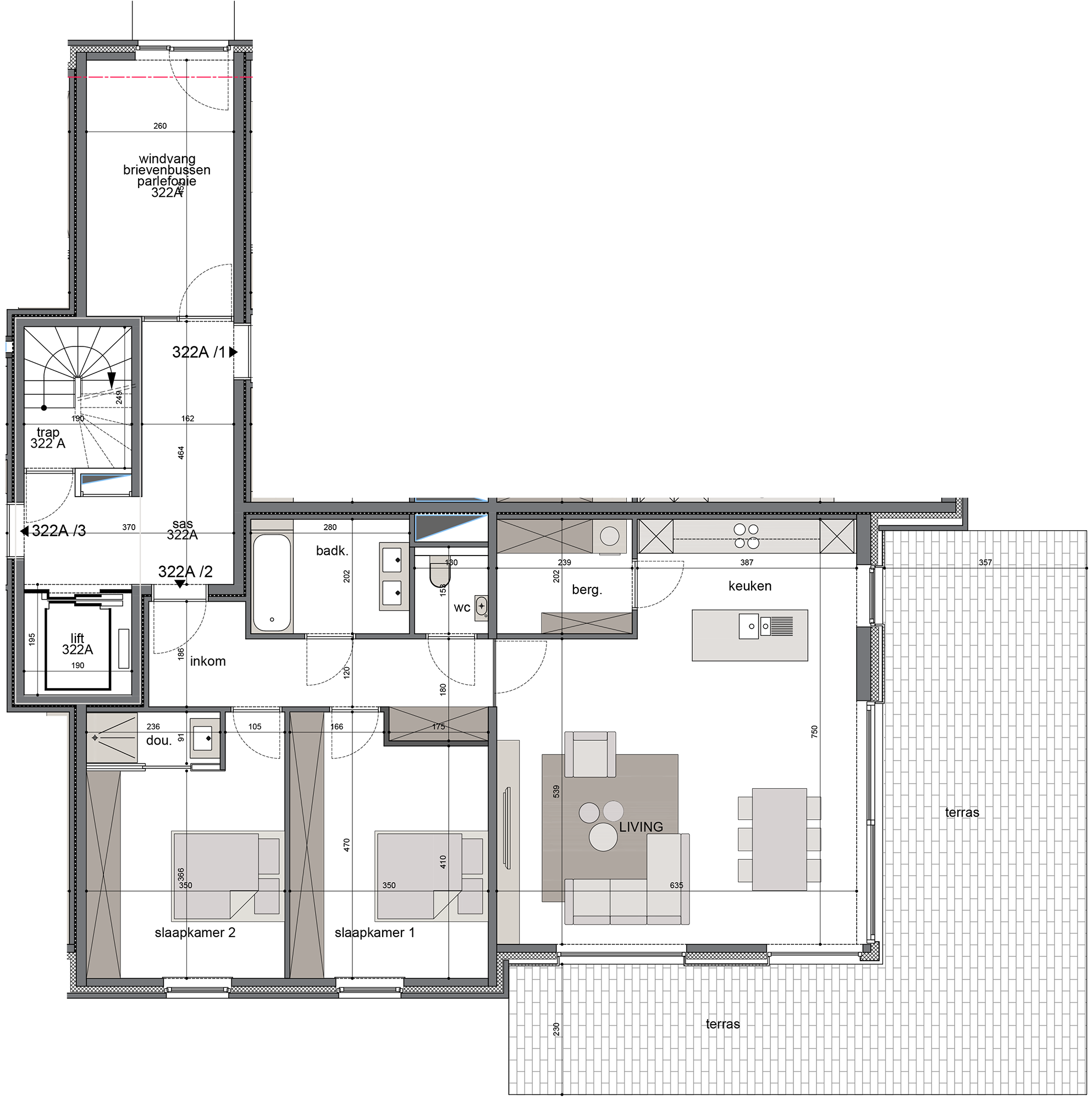 Gebouw 322 heeft twee centraal gelegen appartementen op het gelijkvloers, twee op de eerste verdieping en twee op de tweede verdieping. De ruime appartementen hebben grote terrassen zowel aan de living als aan de slaapkamers.